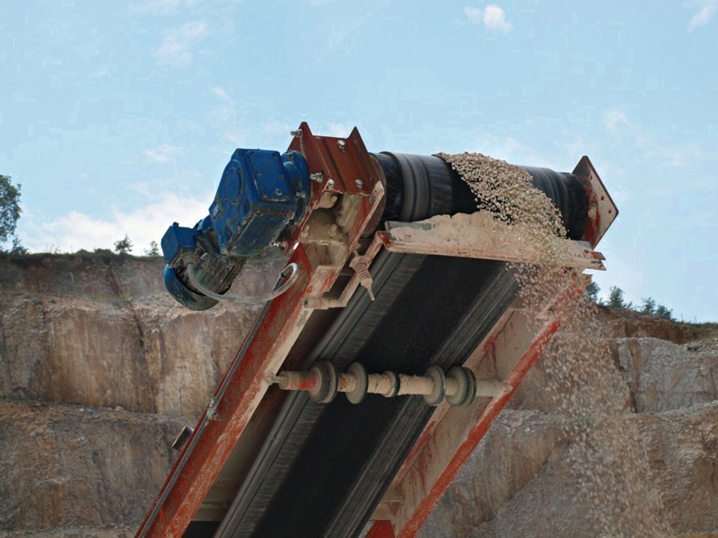 Various different systems, each presenting their own challenges, are used for transporting the material. The belt conveyors used for transporting the large rocks have to overcome gradients of up to 25 degrees. The ground stone with a size range up to 250 μm is conveyed by bucket elevators comprising a double chain strand or a centre chain strand, a link chain or a belt carrying V-shaped buckets made of steel or plastic that are continuously loaded with material.