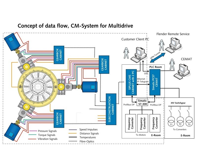 Supervision and control of all users involved, such as hydraulic pumps, bucket elevators, blowers, conveyors etc. and sub-control systems such as CMS, frequency converters, weighing feeders and so on.