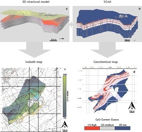 Each stratigraphic layer represents a homogeneous geobody and is modelled as 3D grid object, called SGrid in GOCAD®. This allows the combination of structural information and rock specific parameters and can be used to display three dimensional patterns of the integrated parameters. In the present study, the geochemical parameter “CaO content” was implemented into the SGrids. Since the product range of a lime works is not based on accurate CaO contents in percent, a relative scale for the different CaO contents of three classes is used. The “Werksteinbänke” represent the layers with the highest CaO content and thus, are grouped in class 1. The “Wellenkalke” represent class 2, and the economical non considerable overlying “Mittlerer Muschelkalk” and underlying “Röt” represent class 3. 2D maps are created out of the model (Fig. 4), showing either CaO content classes for each extraction level (geochemical maps) or structural data of the different stratigraphic layers (structure maps). Each map provides three types of information: the x-y-coordinates and either the CaO content class or the altitude (z-values). The geochemical maps were created in GOCAD® by intersecting the SGrids with the altitudes of the specific extraction level. The maps show the spatial distribution of the three CaO content classes for each extraction level. Active extraction areas can be displayed as well as different scenarios with possible new extraction levels may be created. The structure maps are created out of the top of each stratigraphic layer.