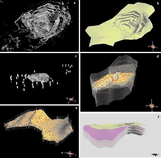 The x-y-z-coordinates of the TLS point cloud (Fig. 3a) were the base for modelling the quarry’s surface plane within the mining claim boundary (Fig. 3b). Together with the measured layer orientations, which are integrated as well objects in GOCAD®, and well data from former prospection drillings the stratigraphic unit planes of the deposit were modelled (Fig 3 c, d, e). Finally, the 3D model of the recent mining state was built by the intersection of the HRDEM with the stratigraphic unit planes (Fig. 3f).