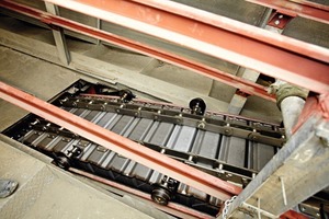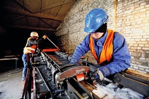 In contrast to traditional assembly systems, in Rüdersdorf preassembled belt mat segments (Fig. 2) were composed for the track which was installed especially for the preassembly. At the start of the steepest incline of the conveyor, prior to the transfer on to the silo loading belt, the existing conveyor bridge was opened up and a link created between the assembly line and the newly installed track (Fig. 3). Beginning with the lower run, the preassembled belt mats were drawn into position via this new link and connected to a continuous apron conveyor. Then the conveyor bridge was closed again. Employing this system the cold commissioning was performed on 15.02.2012.
