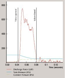 Figure 5 illustrates the force and pressure curves of a typical air cannon discharge. The blast force output reaches its peak in the milliseconds just after the valve is opened, dropping quickly as the tank pressure approaches zero.