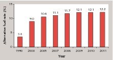 Proceeding from today’s situation, it will be necessary to make far greater efforts if the ambitious targets for 2030 and 2050, requiring a CO2 emission reduction by the factor of 3 to 7, are to be achieved [6]. Fig. 8 indicates how difficult the realization of these aims is likely to be. It shows the development of the alternative fuel rate for Holcim, one of the leading companies on this sector. With a rising usage rate of alternative fuels, the incremental increase progressively declines. This saturation effect is partly a consequence of problems with obtaining and processing the fuels, but is also due to the fact that an increasing alternative fuel usage rate results in a significant increase in equipment and handling costs [6]. At present, Holcim achieves a biomass rate of 25 % in its alternative fuels. In the developed countries it will be difficult to improve on this rate.