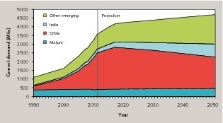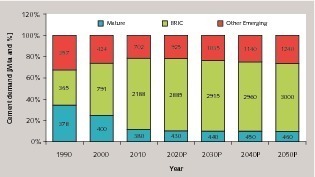 The ratios of the BRIC countries Brazil, Russia, India and China will alter. China’s share will substantially decline between 2016/17 and 2050 to 60 %, while India’s share of 9.6 % (2010) will increase to 25.0 % (2050) (Fig. 3). It is expected that India’s production volume in 2050 will be 750 Mta. In 1990, Russia’s figure of 83 Mta represented a share of 22.7 %, which slumped to 2.3 % by 2010. In 2050 Russia will be producing around 200 Mta, which means a share of 6.7 % in the BRIC countries’ figures. Brazil will overtake Russia and will be producing about 250 Mta of cement by 2050. Figure 4 shows the situation again for the mature (developed) and emerging countries. This shows the great influence of the BRIC countries, which will, however, lose a few percentage points from 66.9 % in 2010 to 63.8 % in 2050. The winners are the other emerging nations, who will increase their share from 21.5 % to 26.4 %.