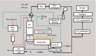 Three main CCS technologies are offered: post-combustion, pre-combustion and oxyfuel processes. Pre-combustion processes are not applicable in the cement industry. Post-combustion processes apply a chemical absorption method. According to the ECRA, no CCS systems have yet been put into operation in the cement industry. Figure 14 illustrates the design principle of an absorption system, in which e.g. ammonia is used as the solvent. For comparison, Figure 15 shows an oxyfuel process that includes an air separation unit and needs pure oxygen to be used in the cement manufacturing process instead of air. While an absorption process affects the clinker production process only slightly or not at all, an oxyfuel process involves the issue of changed CO2 partial pressure behaviour in the production process, for which hardly any research data is available. Moreover, it can be expected to affect the burning characteristics or cause changes in the burning zones in the kiln. Up to now, there are no findings indicating a significant effect on the cement properties [11].
