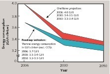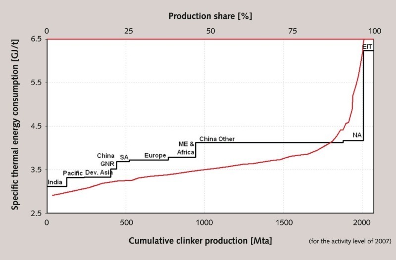 The WBCSD/IEA projection assumes on the basis of the ECRA Technology Papers that the average thermal energy consumption of 3.7 GJ/t clinker (Europe, 2006) can be reduced to 3.3-3.4 GJ/t clinker by 2030 and to 3.2-3.3 GJ/t clinker by 2050. However, the actual global figures are still significantly higher than these figures (Fig. 5). Lower figures are only achieved by plants in India and other Asian countries. The newest and best clinker production lines in China achieve 3.5 GJ/t clinker. Other Chinese plants have consumption figures of 4.1-4.2 GJ/t clinker. Plants in North America and in the CIS countries have significantly worse figures because of the still large number of wet-process kilns. By 2030 the wet kilns will certainly have been completely replaced by new modern plants. However, the plants with large capacities that have recently been built in China – and these have a total capacity of over 1000 Mta – will not yet have been replaced by 2030.