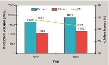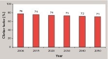 Figure 11 shows market data for China based on the cement and clinker production figures published by the China Cement Association (CCA) and the China Building Materials Academy (CBMA). According to these, 1868 Mta of cement and 1152 Mta of clinker were produced in 2010, for example. These figures result in a clinker factor of 61.7 % for 2010 after e.g. 64 % for 2009, if one calculates from the figures of the previous year. These figures may seem unrealistic, but they reflect the Chinese efforts to produce cement in the most cost-effective manner possible. Given China’s current global market share of 57.1 % and the estimated clinker factor of 79 % in the rest of the world, the present global clinker factor is already below 70 %, or to be precise, 69.1 %. This scenario indicates that it should be possible to even achieve a clinker factor of 60 % in 2050. The CO2 emission reductions due to the reduced clinker factor will be 26 % (10 % WBCSD/IEA projection).