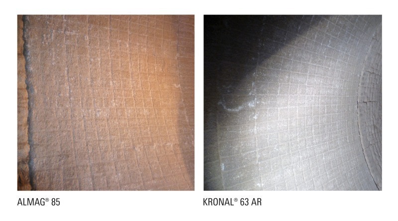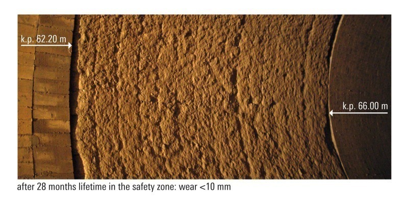 Lars Vieten (Technical Area Sales Manager, Refratechnik Cement GmbH) showed which materials can be used in the kiln safety zone that is affected by alkalis. KRONAL® 60 AR was developed specifically for the areas that are subjected to severe thermal and chemical stressing. In an example of its use Mr. Vieten was able to show that even with an AF substitution rate of 90 % in a kiln, the wear measured in the safety zone was only 10 mm after a lifetime of 28 months (Fig. 5). KRONAL® can reduce or even prevent ring formation. The product is also used in the static areas of the cement plant that are subject to severe chemical load, such as bullnose, calciner, kiln hood, etc.
