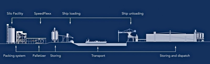 The SpeedFlexx Loader (Fig. 4), a new development from Haver & Boecker, attracted a great deal of attention due to its high loading speed and the unique logistical flexibility it offers to the market. The SpeedFlexx now rounds out Haver shipping logistics by combining direct, just-in-time, loading and conventional palletizing technology with stocking. With this new development Haver & Boecker has now become a full line provider (Fig. 5).