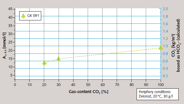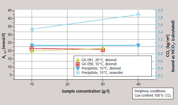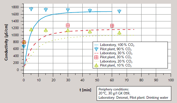 The scrubbing suspension was in each case put into the reactors prior to the tests and kept in suspension by means of vane-type agitators. Continuous measurement of pH and conductivity during the course of each test provided information on the progress of the dissolution reaction and the rate of calcium hydrogen carbonate formation. Final total alkalinity (AT 4.3) was measured in the supernatant water of the scrubbing suspension after the attainment of lime/carbonic acid equilibrium. CO₂-removal efficiency was then calculated using the final parameters of conductivity, pH, temperature and AT 4.3.