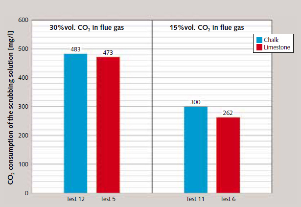 Direct comparison of the CO₂ removal efficiencies of the two processes favours the amine-based (MEA) scrubbers used for the CCS processes. Up to around 800 mg CO₂ were absorbed per litre of scrubbing fluid in the practical tests performed using the limestone scrubber. At approx. 44 g/l scrubbing solution (differential loading 0.2 mol/mol), the CO₂ absorption achieved using a 30 % solution of monoethanolamine (MEA) is greater by almost two orders of magnitude, depending on the specific process selected. The disadvantage of the significantly lower solubility of carbon dioxide in the limestone scrubber can to some extent be balanced out by means of corresponding process configuration and operation. In a cascade configuration, in which a number of scrubbing stages, each treating the flue gas received from the previous stage with fresh scrubbing solution, are installed one after the other, CO₂ removal efficiency can be raised from stage to stage. This arrangement also increases scrubbing-fluid consumption and investment costs, however.