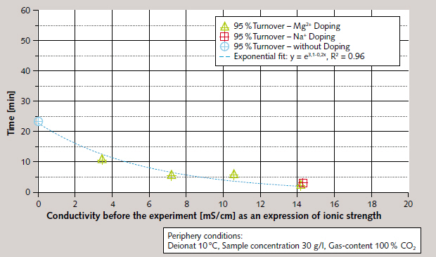 Further tests were performed using samples of water doped with NaCl and/or MgCl₂ ∙ 6 H₂O, since it was suspected that the pronounced influence of seawater on separation efficiency might be the result of this water’s high magnesium ion concentration. These tests indicated that simple dependence on ion concentration exists, irrespective of ion species. Ion concentration also had a positive influence on the rate of CO₂ conversion to (HCO₃-) , with an exponential dependence on initial conductivity, as an expression of ion concentration (Figure 5).