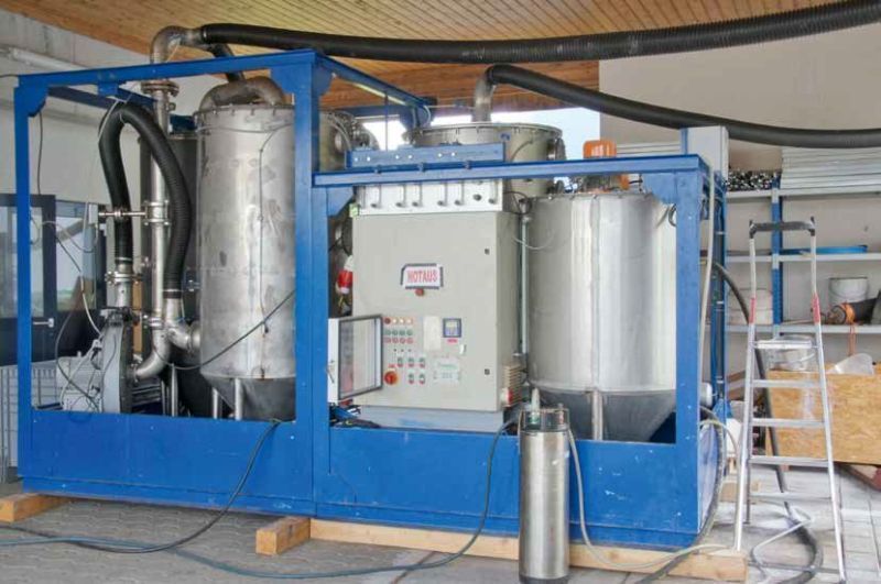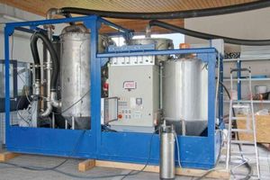The experimental scrubber system was connected to the flue gas pipe by means of a heat-resistant plastic hose (inner diameter: 115 mm). Volumetric flue gas flow through the experimental scrubber was reduced to ≤ 70 m3/h, corresponding to the design of this system. The flow of flue gas for cleaning was thus at the upper extreme of the experimental scrubber’s performance range, but it was possible to at least partially compensate for this by increasing the volumetric flow of scrubbing fluid, which reached 1400 l/h and around 3500 l/h in the individual tests. After passing through the series-installed absorber stages, the CO₂-reduced flue gas was released to the atmosphere.