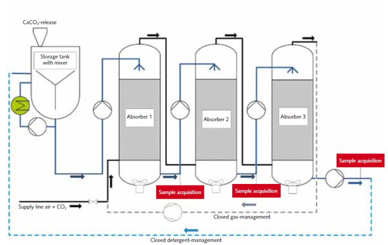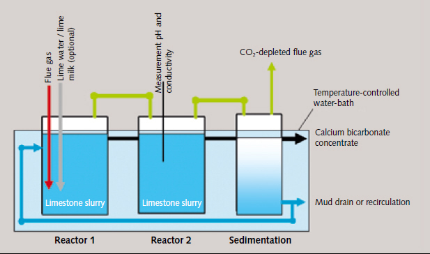 The research project [2] examined here takes a totally different approach: a process which uses a limestone powder suspension to convert CO₂ to water-soluble hydrogen carbonate (bicarbonate; so-called “carbonate hardness” or “carbonate scale”) has been developed. For this purpose, prescrubbed CO₂-containing flue gases, such as occur in flue gas desulphurisation, are submitted to wet scrubbing using a suspension of limestone powder. Calcium hydrogen carbonate (“calcium bicarbonate”), which also occurs as a natural constituent of limnic and oceanic waters, and thus fixes CO₂ in stable equilibrium, is formed, analogously to the natural weathering of limestone, rather than calcium sulphate.