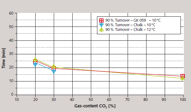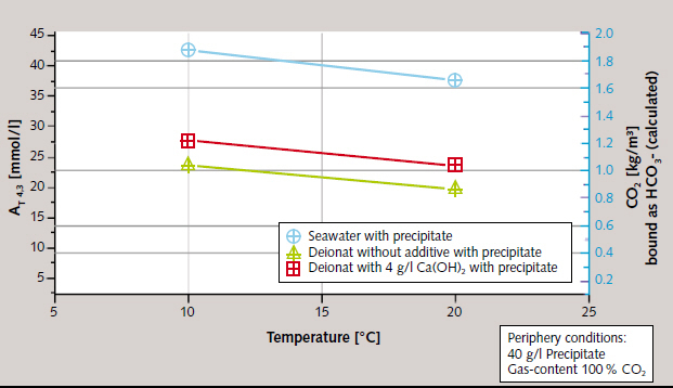 The decrease in solubility in the lime/carbonic acid system as temperature rises is a known phenomenon for which it was necessary, for the planned test system, to determine the exact amounts under the respective given boundary conditions. The influence of temperature was determined for the 10 to 20 °C range on p.a. precipitate in suspensions with differing ion contents. It was 0.02 g/l per °C. It became apparent here that removal efficiency is influenced significantly more by the type of scrubbing fluid than by its temperature (Figure 4).