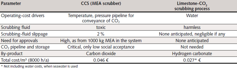 The simple and relatively low-energy process configuration should also be added to the benefits possessed by limestone-CO2 scrubbing over the CCS processes in terms of the environmental impact of the substances in the scrubbing fluid. Unlike the CCS processes, in which the carbon dioxide absorbed by the scrubbing fluid in the absorber is stripped out again, with the input in the desorber of large quantities of thermal energy, the CO₂ remains in the scrubbing fluid after limestone-CO2 scrubbing and can then, for example, be discharged back into the sea. The energy otherwise required for underground compression of the CO₂ is also saved. In addition, the tests performed demonstrated that CO₂ absorption in limestone-CO2 scrubbing is indeed promoted by a surplus of limestone powder, but also that the unconsumed lime can be used again in the scrubbing process with no loss of efficiency. Approximate cost benefit estimates indicated that this fact, in combination with the energy advantages of the process, result in relatively low operating costs.