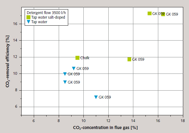 The highest cleaning rates within ecologically and economically rational boundary conditions were achieved in the practical tests using salt-doped mains water. Figure 13 shows the correlation between removal efficiency and CO₂ concentration in the flue gas at a high volumetric scrubbing-fluid flow and with the use of salt water.