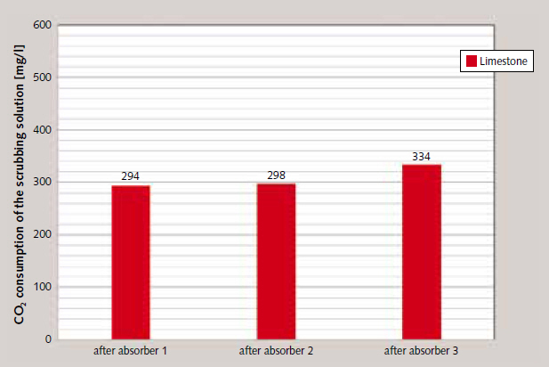 Samples of the scrubbing fluid were taken after passage through all of the three absorber vessels in order to determine its maximum CO₂ absorption capacity and the removal efficiency of each respective absorber stage. Figure 11 shows the scrubbing fluid’s CO₂ absorption in the final absorber. On this basis, up to 483 mg CO₂ are absorbed per litre of scrubbing solution in scrubbing of synthetic flue gases containing 30 %vol. CO₂, and up to 300 mg per litre of scrubbing solution in processing of flue gases with a CO₂ content of 15 %vol. (Figure 11).
