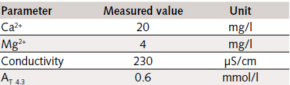 The same products as used in the pilot-scale tests were used here as calcium-carbonate-containing additives, at concentrations of 3 %wt. and 1.5 %wt., respectively. A series of tests involving the addition of approx. 3.5 %wt of sodium chloride (99 % NaCl) served the purpose of evaluation of the use of seawater. Two water supplies were available at the Bad Orb sewage-treatment plant, the municipal mains water supply being selected for use after preliminary tests, thanks to its constant chemical composition. The relevant analytical data are shown in Table 1: