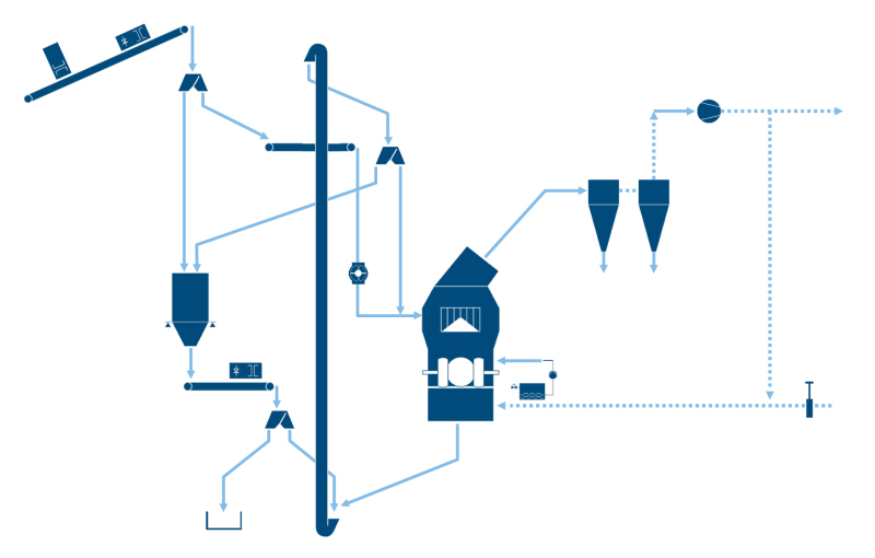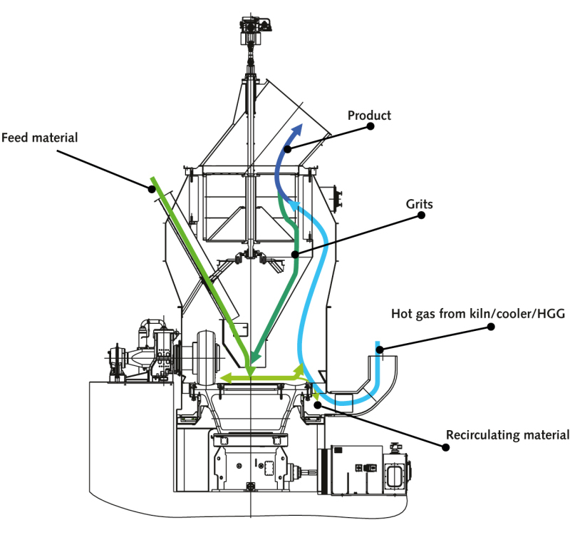 Together with the gas flow the fines leave the mill via the mill exit and are collected in cyclones. The system fan is arranged after the cyclones. The hot gas used for drying comes from the kiln preheater and is mixed with return air before being supplied to the mill.