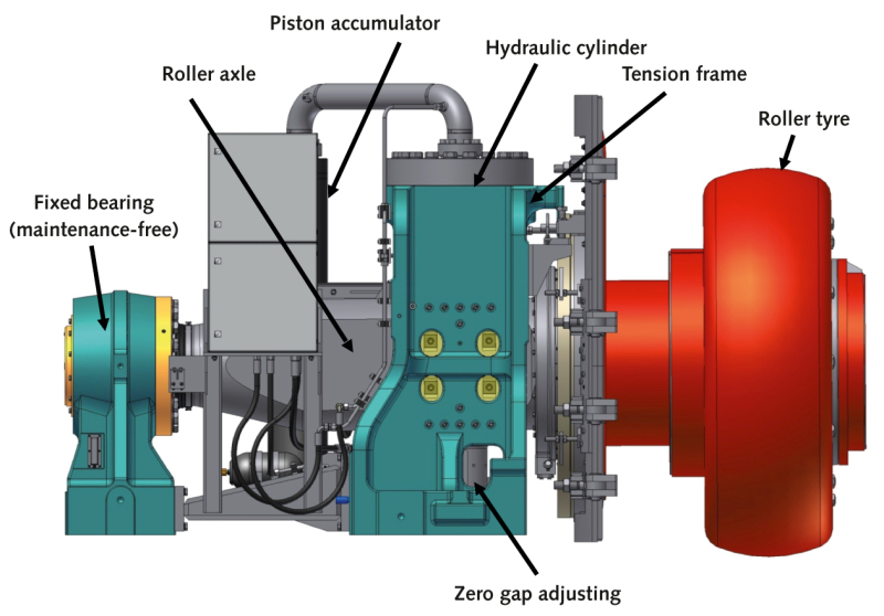 The roller units are shown in Figure 4 in more detail. The bearing units of the Quadropol2 roller units are mounted on concrete foundations. The hydraulic system is incorporated into the tension frame. Every roller unit has only one hydraulic cylinder for the working pressure and one accumulator. This is a simple hydraulic system and therefore very easy to maintain.