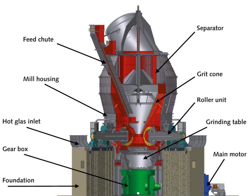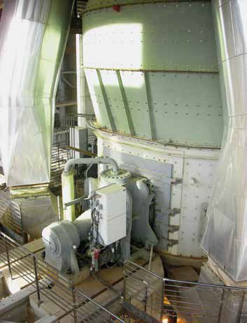 the force-free mill housing with its hot gas inlets and maintenance doors,