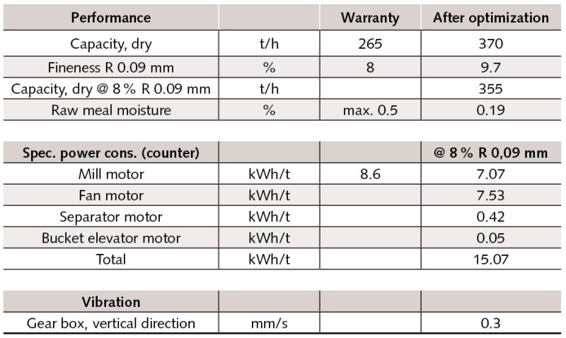 The warranted specific power consumption for the mill main motor was 8.6 kWh/t at a fineness of 8 % residue on the 90 micron screen. The specific power consumption was referred to a raw material mixture of 92 % limestone, 4 % quartzite, 3.5 % clay and 0.5 % iron ore.