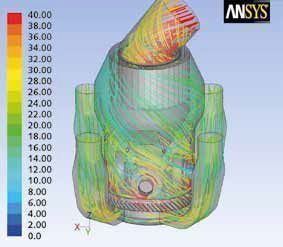 As the shape of rollers and grinding table and the applied grinding force has not been changed compared to the previous version of the Quadropol it can be assumed that an improved dam ring design and optimized gas flow in the mill contribute to the excellent performance of the QMR2. CFD analysis during the design phase have shown that the circumferential nozzle ring with inclined guide vanes causes a swirl in the mill providing a very even gas and material load on the separator (Fig. 6). This again provides for a very good separation efficiency which is proven by well separated grits containing no fines.