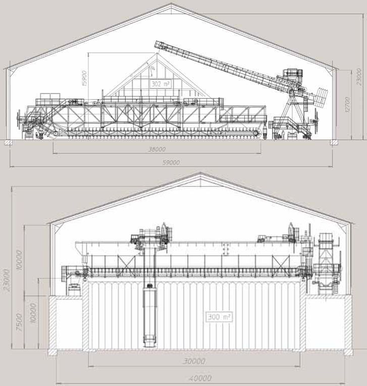 Considering that the covering sheds including roofing and cladding can have a weight of about 60/70 kg per m², the traditional storage shed will weigh about 1050-1100 t, whereas the BEL C system shed weight will be only about 50 % of that (500-550 t).