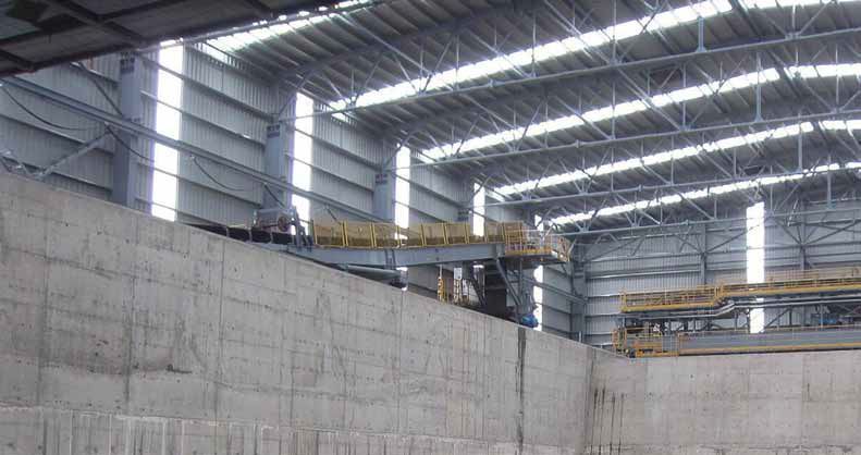 The tripper is motorized in order to be shifted and connected with each stacking bridge. The tripper feeds the retractable belt conveyor that feeds the shuttle reversible belt conveyor, creating the piles. Through the movement of the stacking bridge back and forth along the warehouse, the stacking cycle allows for the creation of small longitudinal chevron piles, parallel to each other.