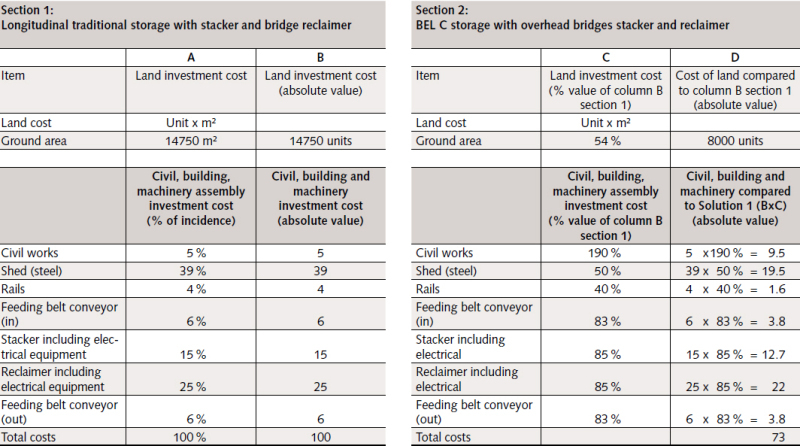 As seen for the investment costs, it is interesting to examine Table 1 and compare Section 1 with Section 2. We assume values included in Table 1 and relate them to the traditional system stacker/bridge reclaimer as an equal to 100 % of the investment.