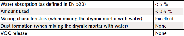 Manufacturers of gypsum construction materials have been looking for a water repellent that would be suitable for use in drymix processes, would be exceptionally efficient, pose no problems when mixed with water, and would not release any VOCs when used (Table 1). Regarding water repellency, a few manufacturers of gypsum construction materials indicated that an ideal additive would reduce water absorption to below 5 percent by weight (after being stored under water for two hours, as described in EN 520). These manufacturers anticipate that absorption below this level would allow them to make universal dry mixes for use in any interior applications.