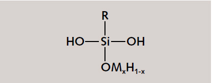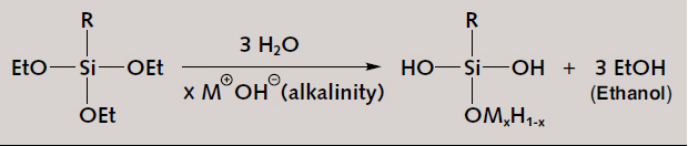 When gypsum drymix mortars that include this kind of carrier-based or encapsulated active agent are mixed with water, the liquid substance leaves its “packaging” and is converted to the actual active agent (an alkyl or polyalkyl silicic acid) via hydrolysis (Fig. 2). There are numerous disadvantages associated with the use of these traditional solid water repellents, however: