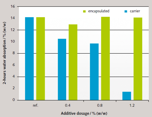 First of all, the solid additive contains very little active substance, because the carrier and/or encapsulating material can only accommodate around 30 % of the precursor. Loading these materials with larger amounts of liquid yields a sticky additive that is no longer free flowing. Because the carrier and/or encapsulating material itself has no effect whatsoever, at least 70 % of the bulk of the additive contributes nothing toward making the mortar water repellent. This, in turn, means that large quantities must be used, which is why traditional solid water repellents are so inefficient.