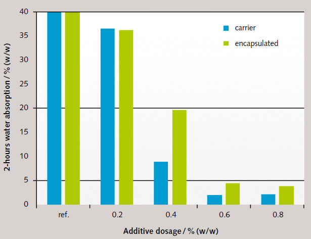 As described earlier and as expected, the pH of the gypsum substrate has a major impact on efficacy. This is because the actual active agent has to be generated in situ via alkaline hydrolysis. As such, the encapsulation system is completely ineffective in a joint filler with a pH of 9 (Fig. 4), as the hydrolysis reaction clearly proceeds too slowly at this pH to release enough silica groups. The poor efficiency of traditional additives is also evidenced in lime-gypsum plasters for manual applications (Fig. 5): despite the high pH of 12, satisfactory results depend on a high concentration of water repellent.