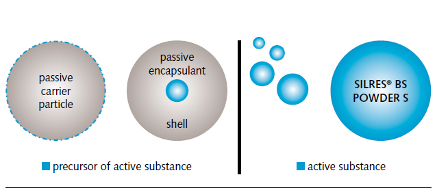 In order to obtain free-flowing, solid additives from available liquid agents, silicone manufacturers and formulators have had to make use of a trick: they take the active agent, which is itself a liquid, and either encapsulate it within a solid material or adsorb it on a solid carrier material, thereby creating a vehicle for introducing and blending the agent into the drymix mortar formulation (Fig. 1, left). In practice, silicone manufacturers do not even actually use the active agent itself (an alkyl silicic acid), but rather a liquid precursor of the active agent, such as an alkyl silicic ester, a polyalkyl silicic ester or mixtures of these (also known as alkylalkoxysilanes and alkylalkoxysiloxanes). They do this because the actual active agent is highly reactive, ruling out the option of isolating it and using it directly.