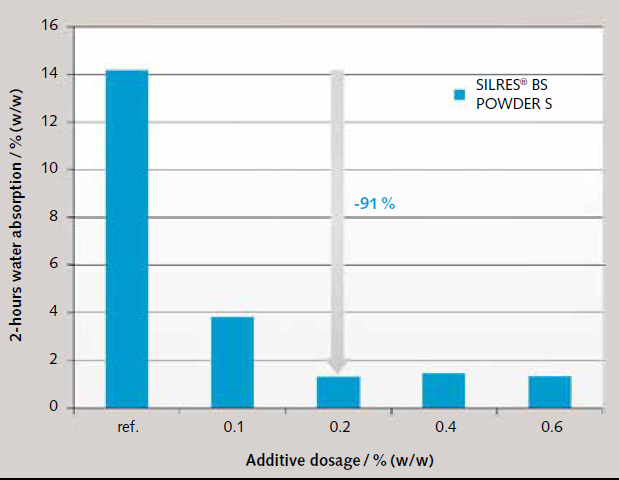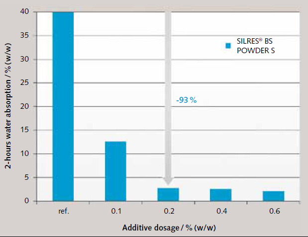 As a highly effective water repellent, SILRES® BS Powder S can produce side effects under certain circumstances. For this reason, tests were performed to establish what properties other than water absorption are affected by the addition of water repellent and to determine the concentrations at which these side-effects occur. The studies revealed that SILRES® BS Powder S can affect the amount of air pores (determined as directed in EN 1015-7) in fresh mortars that have been combined with water. This effect is particularly pronounced in gypsum plasters for machine application, which contain more air entrainers than hand-applied plasters. When the additive is used at a concentration of 0.2 %, for instance, the amount of air pores diminishes slightly, which can be controlled by adjusting the formulation, i.e., by modifying either the concentration or the type of air entrainer.