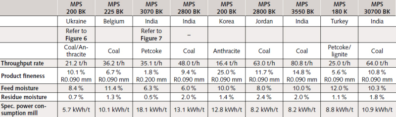 These data show the wide range of application for MPS coal grinding mills. Petcokes with low volatile contents need a significantly higher product fineness compared to hard coal and lignites to achieve the optimum burnout performance. Additional figures for different mills are given in Table 2.