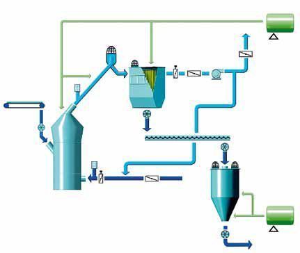 The grinding plant may be operated under non-inert conditions, when grinding low explosive coal types. With non-inert operation exhaust air from the clinker cooler could be used for drying the coal. As a common safety precaution the coal grinding system is operated under inert conditions. This can be achieved by using exhaust gases from the kiln preheater in a cement plant. Figure 2 shows a general plant layout. The coal is fed into the mill through a pressure shock-resistant, self-purifying rotary feeder. After being dried, ground and classified in the mill system, the finished product extracted from the classifier is collected in a bag filter, discharged via screw conveyors and a rotary feeder. The product is then conveyed pneumatically to the coal intermediate silo. Quick-acting dampers are installed in the gas ducts before and after the mill, serving as a safety system in addition to the mill, filter and silo being rendered inert with CO2. The filter and silos are equipped with pressure relief valves to vent the shock wave and to release possible flames into the atmosphere in case of an explosion. Measurements of CO, O2 and dust are taken downstream of the filter for monitoring the grinding plant. CO and temperature are monitored in the pulverized coal silo. If the preset limits of CO and O2 concentration are reached, the safety systems, such as safety dampers, CO2 inertization of the mill, filter and silo are activated.