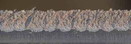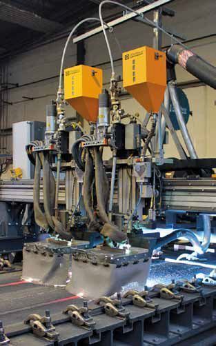 As the power source, two parallel GTH 1002 welding rectifiers are used. These systems work constantly with a welding current of up to 1000 amperes, which means that they are robust enough to weld long seams on large workpieces. The coated sheets (Fig. 2) correspond to the quality offered by Fidur 10/65 P, which means that they are highlyresistant to abrasive wear. Increased carbon and chromium content in the welding material is used to achieve a high level of hardness and wear resistance.