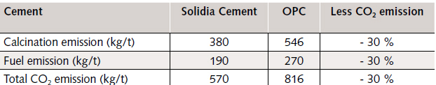 Overall, approximately 816 kg of CO₂ are emitted from a cement kiln per ton of Portland cement clinker. The production of Solidia Cement clinker (Fig. 2 and 3) can reduce this quantity by approximately 30 %. The overall CO₂ emissions for making one ton of Solidia Cement clinker in a five-stage pre-heater kiln with pre-calciner is estimated to be around 570 kg, of which 380 kg derives from the raw materials and approximately 190 kg from the fuel combustion. This comparison is tabulated in Table 1.