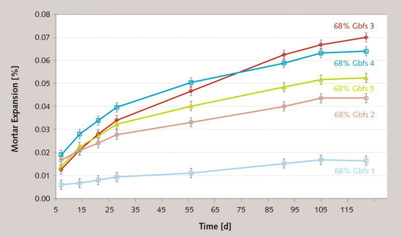 Proceeding from the state of the art listed above and considering the possibility that also 65 % GGBFS composites can fail in standard mortar tests such as ASTM C 1012, the influence of the alumina content in GGBFS on sulfate resistance as well as the effectiveness of mitigating measures should be studied in a more systematic way, including a wide range of GGBFS qualities used by Holcim companies. The alumina contents of these slags range from 9 to 19 %.