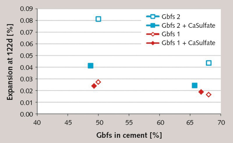 The higher the GBFS content in the total cementitious phase, the better is the sulfate resistance (Fig. 6). Our results show that the expansion of the mortar with 50 % of GBFS 2 in the cement plus Ca-sulfate addition after 122 days was similar to that of the 68 % composite of GBFS 2 without Ca-sulfate addition. This implies that Ca-sulfate additions might allow for a certain reduction of GBFS content in sulfate resistant cements. This however needs to be supported by further studies.