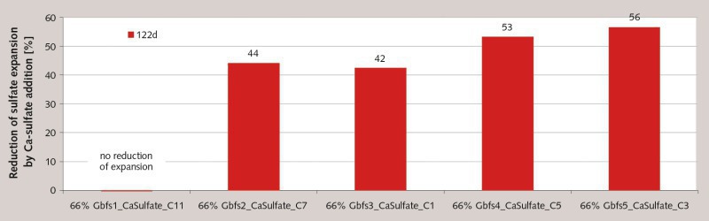 For the low alumina GBFS 1 composite, which had the lowest expansion, the Ca-sulfate addition had no such effect. For the composites with GBFS 2 and 3 with 11.2 and 14.6 % alumina respectively, Ca-sulfate additions reduced sulfate expansion at 122 days by 42 to 44 %. An especially high reduction of sulfate expansion by over 50 % was achieved for the high alumina GBFS 4 and 5 composites, when Ca-sulfate was added.