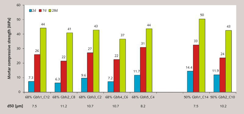 The faster hydration progress is confirmed by the extraordinary strength development of the mortar with GBFS 5 (Fig. 3). Looking at the sequence at 55 days, the composite with GBFS 3 (14.6 % alumina) would follow and finally that with GBFS 4 (18.7 % alumina).