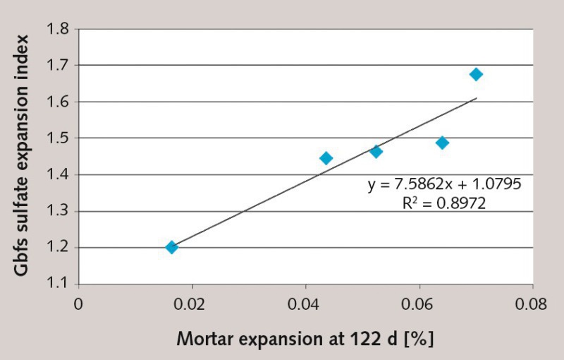 The GSEI correlates reasonably well with the sulfate mortar expansion observed at 122 days (Fig. 4). Based on this data set, the GSEI gives a rough indication, if a GBFS of a given quality would need special attention when used in high sulfate resistant cements, for instance regarding optimization of sulfate content or particle size distribution. The usefulness and robustness of the GSEI index has to be confirmed by additional and longer term tests and by using other test methods.