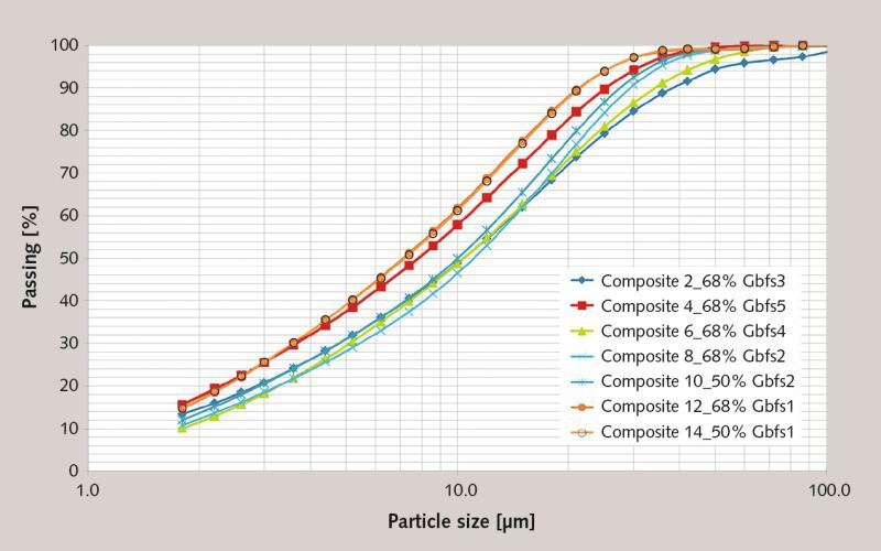 The fineness indicators (Tab. 3) show that the OPC and GBFS 1 had a comparable PSD and fineness, and GBFS 5 comes close to that. Thus, the PSD curves of the composites 12 and 14 are almost identical and the PSD of composite 4 comes rather close (Fig. 1). GBFS 2, 3 and 4 are coarser with GBFS 3 having a rather broad PSD, which is reflected by the PSD of composite 2 (Fig. 1).