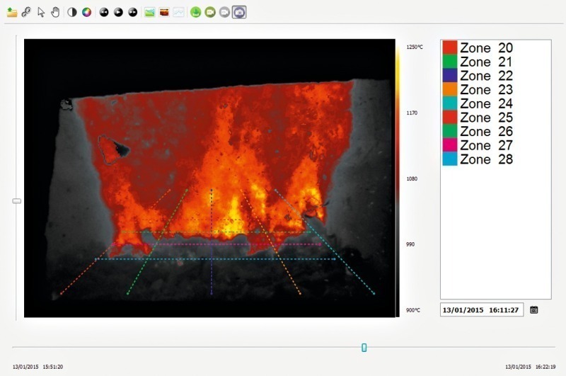 HGH Infrared Systems, based in Paris/ France, and with sales and technical offices in the US, India, Singapore and China, has released an improved generation of thermal scanning equipment. The new Pyroscan is a Gigabit Ethernet pyrometric camera (Fig. 1, 2) for monitoring the inside of rotary kilns and clinker coolers (Fig. 3). This camera enables the detection of any changes on the combustion and the visualization of clinker fall. The operator can instantly see impacts of burner adjustments, variation in raw meal composition or use of alternative fuel. He can also identify process problems, such as clinker avalanche or red rivers formation. Each pixel of the image can be selected by the operator on the video image to measure temperatures, to follow their variations and to check changes in flame shape (flame length/width and black root length).