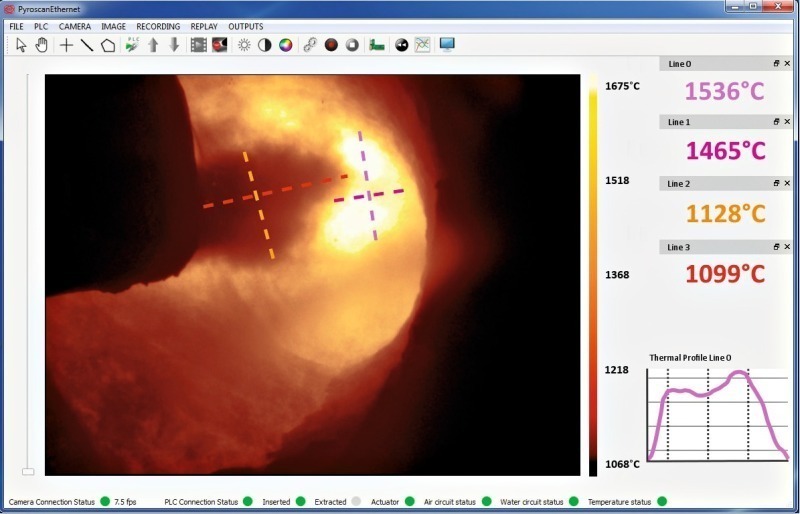 The device is connected to a computer by a Gigabit Ethernet link associated with specific software displaying a high resolution and High Dynamic Range (HDR) thermal image of the burning zone (visualization and temperature measurements inside the kiln). The Pyroscan is a robust and reliable tool, designed to withstand the extreme environments associated with the high burning temperatures within rotary kilns, at up to 1500 degrees Celsius and through very dusty conditions. With the ever-changing challenges in the cement industry –the use of alternate fuels, monitoring raw material quality and finding ways to conserve energy-temperature monitoring is a critical aspect to ensure kiln lifetime, control combustion conditions and prevent process issues such as clinker avalanches and red rivers at cooler input. Visible cameras are not capable of addressing these challenges. Pyroscan comes fully supplied with the state of the art newly updated pyrometric camera, easy to use Windows software and plant installation and support. Available options also include alarm outputs and OPC client which allows for an easy integration with existing software in the control room. The advantages of the new Pyroscan are described by the manufacturer as follows: