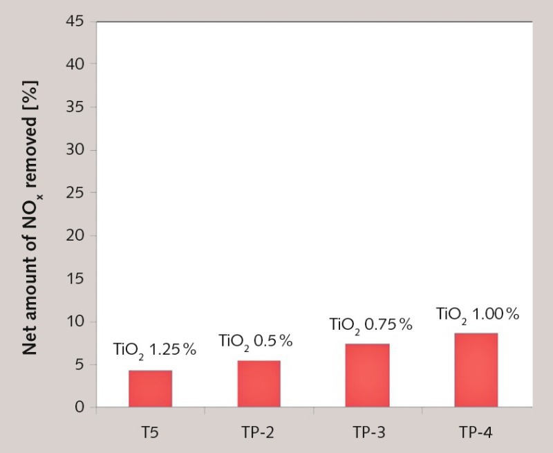Although containing less TiO2, thanks to the accelerator effect of TiPlus on photocatalysis, the NOx removal capabilities of TP-2, TP-3 and TP-4 were higher than T-5.